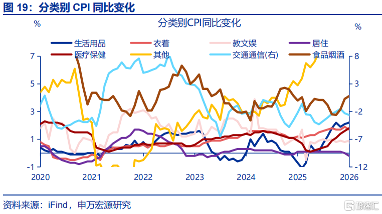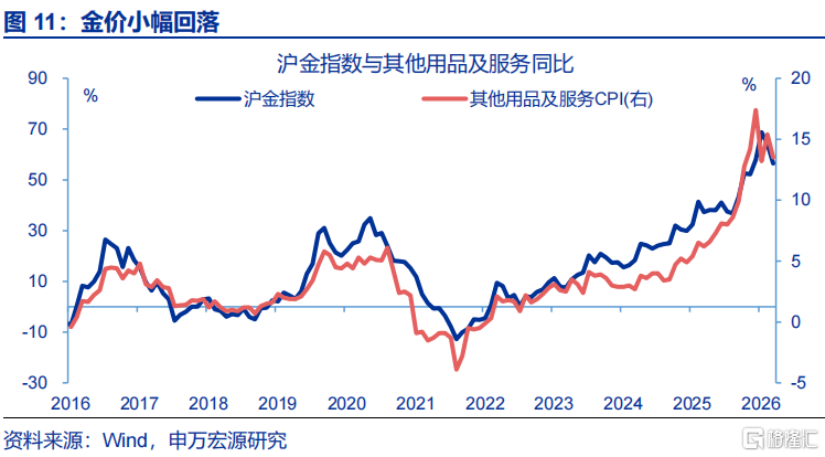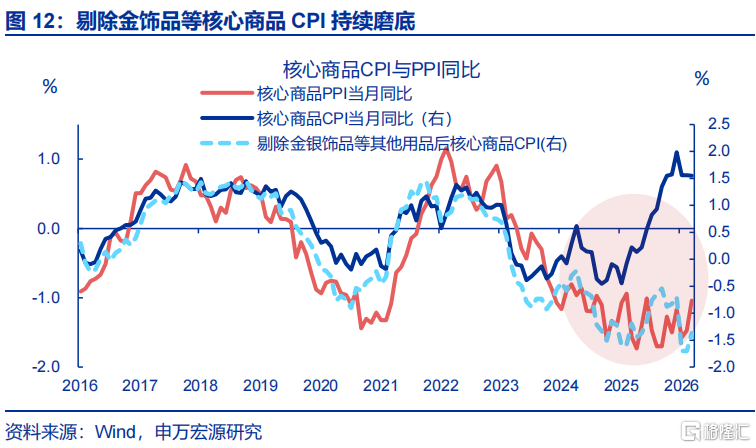 核心商品CPI保管高位,更多源于其他核心商品价钱的撑握。3月,核心商品CPI同比保管高位(1.6%)。结构上,受海外金价下行影响,国内黄金饰品价钱时隔8个月后初次着落。而剔除金饰品后的其余核心商品CPI同比小幅回升、同比上行0.3个百分点至-1.4%,背后更多响应PPI飞腾对核心商品CPI的传导,以及国里面分居品需求回升等影响。