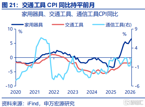 非食物耗尽品CPI:交通器用、通讯器用、交通器用用燃料CPI均有所回升。非食物中,交通器用、通讯器用CPI均有所回升,边因缘别上升0.1、0.7个百分点至-1.1%、2.6%。