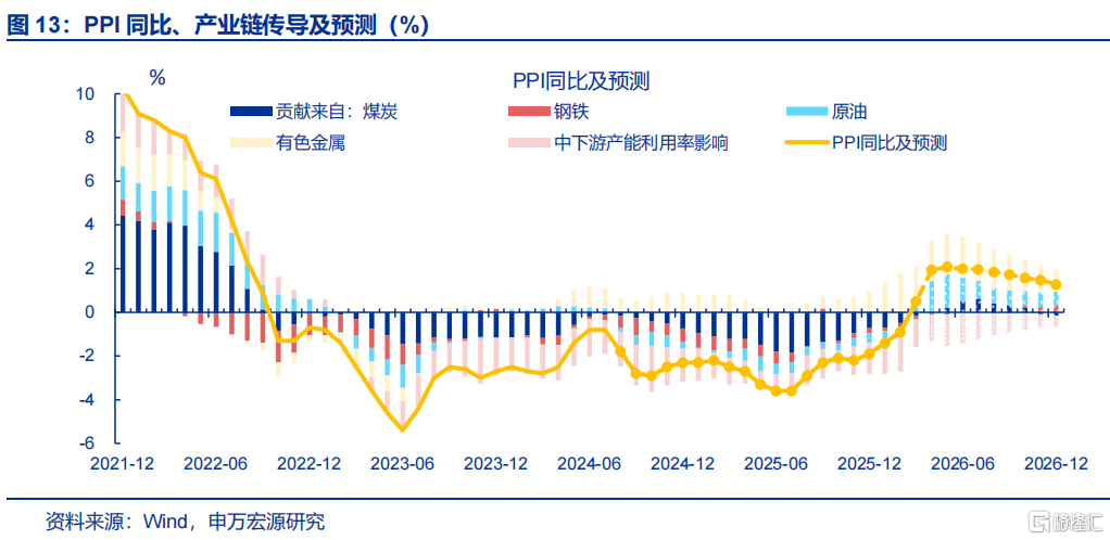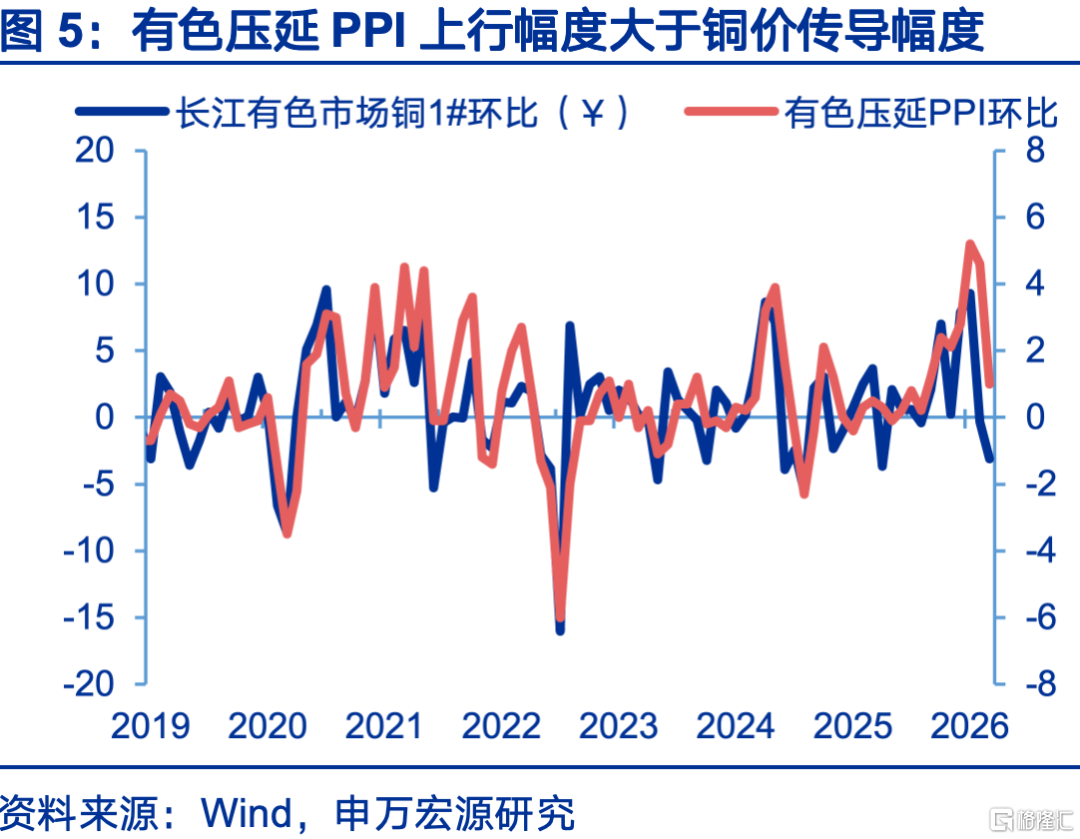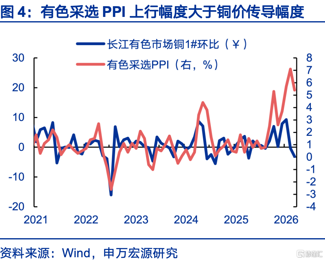 固然铜价有所回落,但稀土、铝等其他有色金属价钱涨幅较大,也特等带动PPI上行。自本年以来,有色选择、有色压延PPI涨幅握续超出铜价本应传导的幅度,主因其他有色加价;3月也呈现访佛情景,高频铜价环比-3.1%,但有色选择(5.4%)、有色压延(1%)环比飞腾,主因稀土(11.8%)、铝冶真金不怕火(0.7%)等价钱飞腾;煤炭、钢铁加价幅度有限,煤炭选择、玄色压延PPI环比离别仅0.1%、0.3%,测算煤钢对PPI的环比孝顺度为0%。