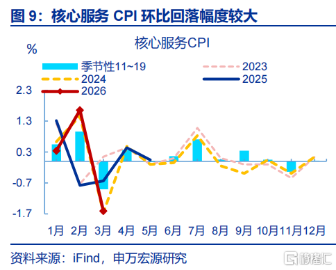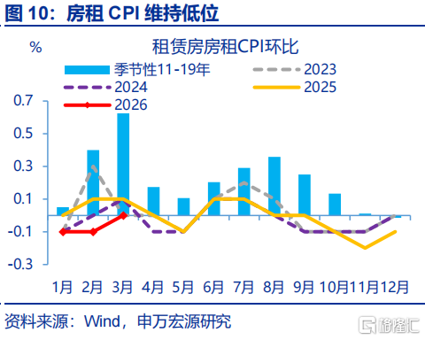 春节后工作需求回落幅度较大,也令工作CPI较着走弱。3月,工作CPI环比(-1.1%)较着低于往年春节次月(-0.4%)。其中,核心工作CPI进展较弱,飞机票、交通器用租借和旅行社收费价钱离别着落29.5%、18.9%和14.2%,三项统统影响CPI环比着落约0.34个百分点;宠物工作、车辆修理与调动、家政工作回落幅度也较大,离别着落10.1%、9.4%、4.9%。此外,现在租房需求偏弱,令3月房租CPI同比保管在-0.5%的历史低位。
