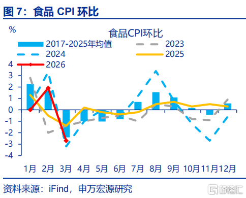 3月CPI进展弱于往年春节次月,其中食物价钱回落幅度大于往年同期。3月CPI环比-0.7%、弱于往年春节后首月的进展(-0.4%)。拆分结构看,受天气转暖供给加多、节后需求回落等身分影响,食物CPI环比-2.7%、较着不足往年春节后首月的进展(-0.8%)。其中,鲜菜和鲜果价钱离别着落10.1%和3.3%、回落幅度较大;猪肉供给加多株连猪肉环比(-7.3%)。
