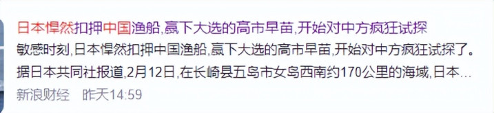 新浪财经——2026年2月13日——日本悍然扣押中国渔船,赢下大选的高市早苗,运转对中方猖獗试探
