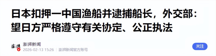 倾盆新闻——2026年2月13日——日本扣押一中国渔船并逮捕船主,应付部:望日方严格恪守筹议协定、公平规则