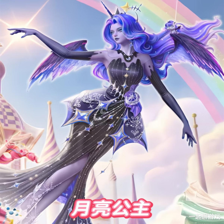 大略是“黑皮”的原因吧,看到月亮公主后目下一亮,黑皮、紫发、翅膀,黑纱晚礼裙,这套装饰足以算得上是C位级别,天哥如故蛮可爱的。