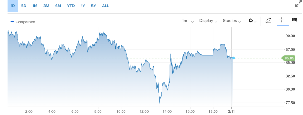 外洋原油阛阓史诗级的过山车行情仍在陆续。3月10日,好意思国WTI原油期货主力合约盘中大跌近20%、击穿80好意思元关节关隘低至77.21好意思元/桶,全球基准英国布伦特原油期货主力合约一同跳水至80好意思元/桶下方。抑遏本日收盘,WTI原油期货单日下降11.32好意思元,收报83.45好意思元/桶,跌幅为11.94%;布伦特原油期货单日下降11.16好意思元,收于每桶87.80好意思元,跌幅为11.28%。