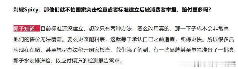 比如有的品牌会把一批真的椰子水送去检测,以应对硬性的检测需求,然而到了消耗者手里的那瓶椰子水,依然照旧加水加糖的勾兑家具。