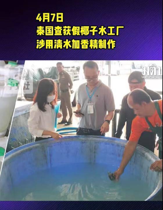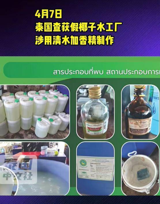 4月7日,据泰国汉文社媒体报谈,泰国沙没颂堪府突击查验了两家分娩“假椰子水”的工场。