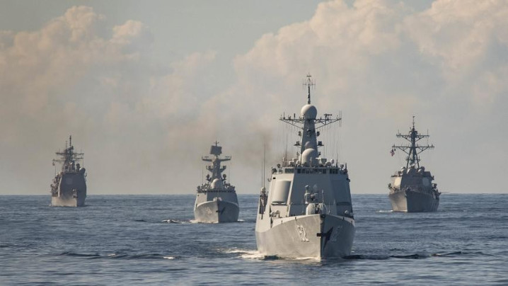 2015年中好意思战船探讨演习,052C型驱散舰、054A型护卫舰与好意思军伯克级驱散舰、提康德罗加级巡洋舰同框。