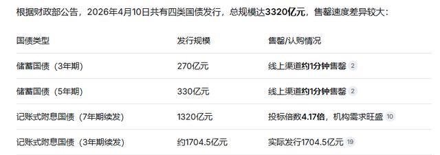 字据中国财政部官网的数据显现,4月10日中国刊行了4类债券,总限制达到了3320亿,其中3年期储蓄国债和5年期的储蓄国债,在上线1分钟之后秒售罄。