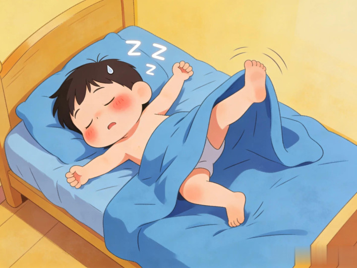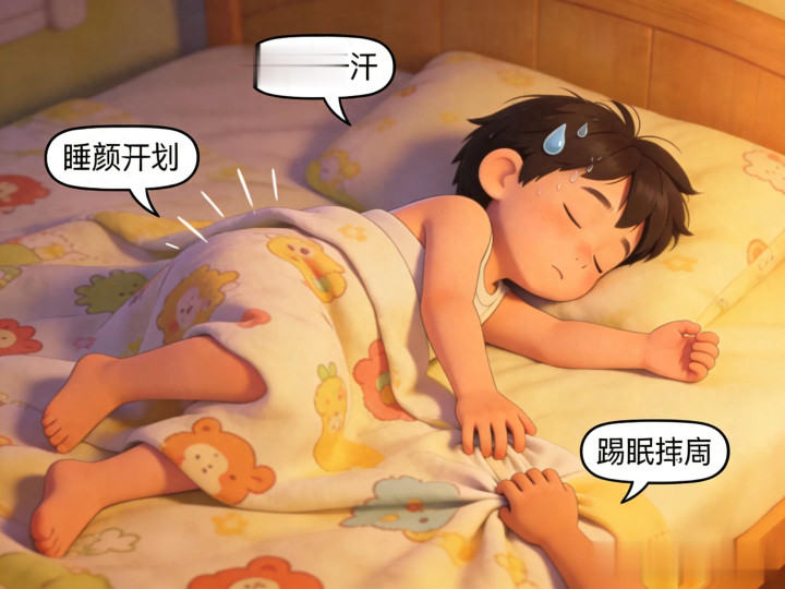 这类孩子平时入睡并不贫寒,但睡着后不厚实,一晚上姿势换个不停,偶然还会说梦话、踢被子。但他们并不会全齐醒来,仅仅寝息较浅,肌肉莫得全齐收缩,是以作为幅度较大,看起来像“满床打滚”。